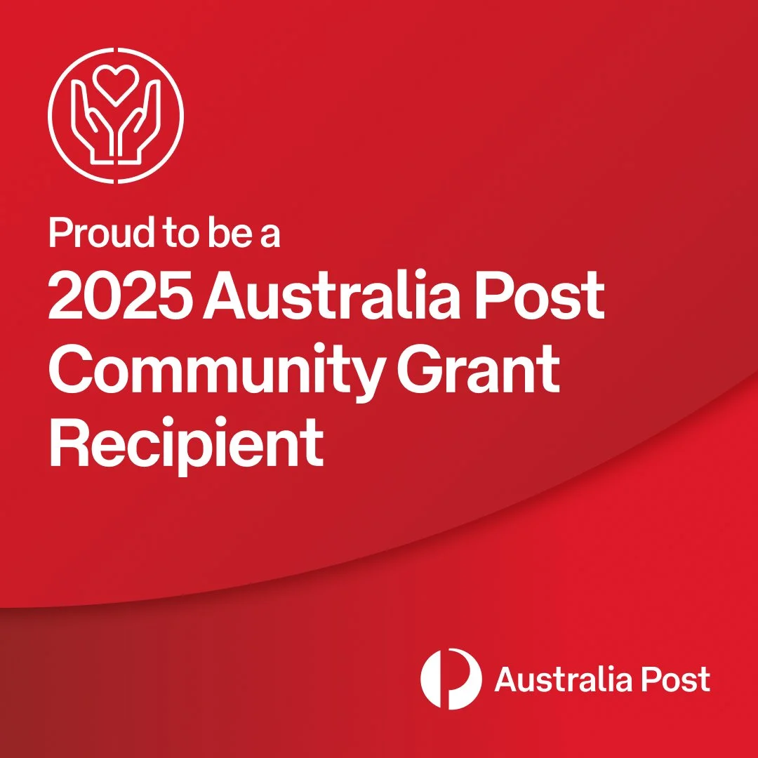 Red background with white text that says, "Proud to be a 2025 Australia Post Community Grant Recipient," and includes the Australia Post logo.
