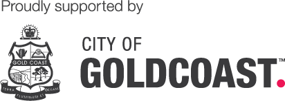 Gold Coast city logo with a shield featuring a crown, a fish, and a tree, and the text 'Proudly supported by City of Gold Coast'.